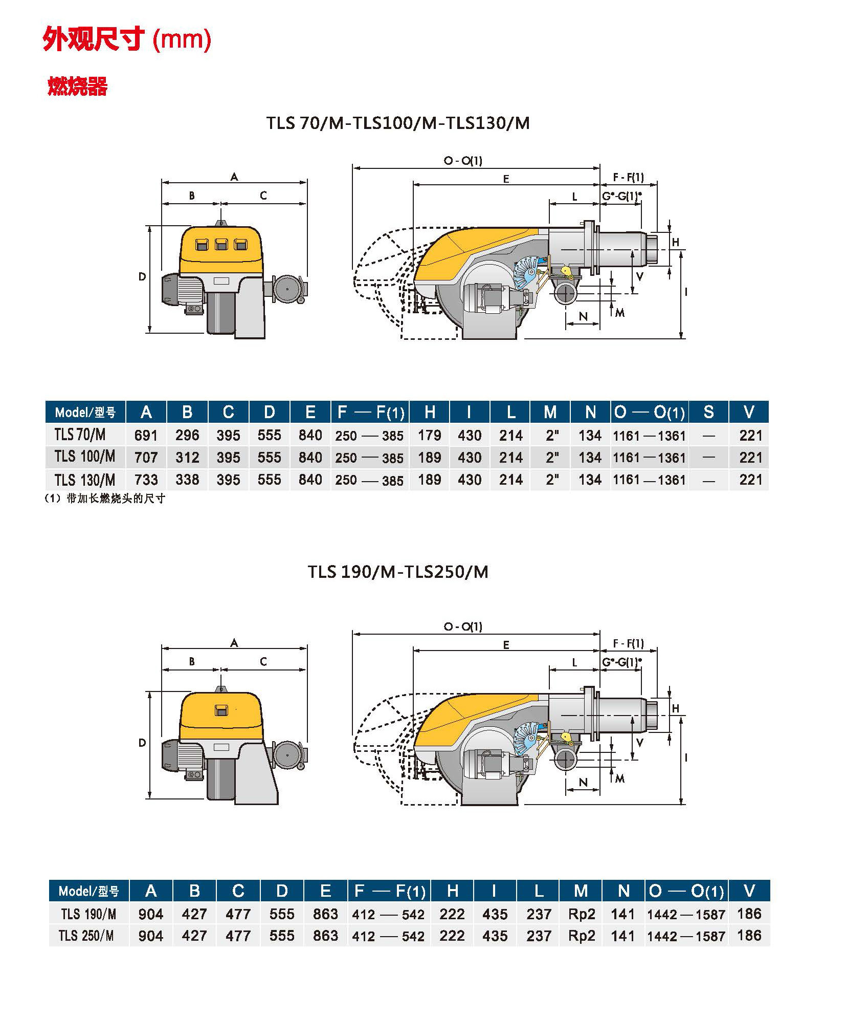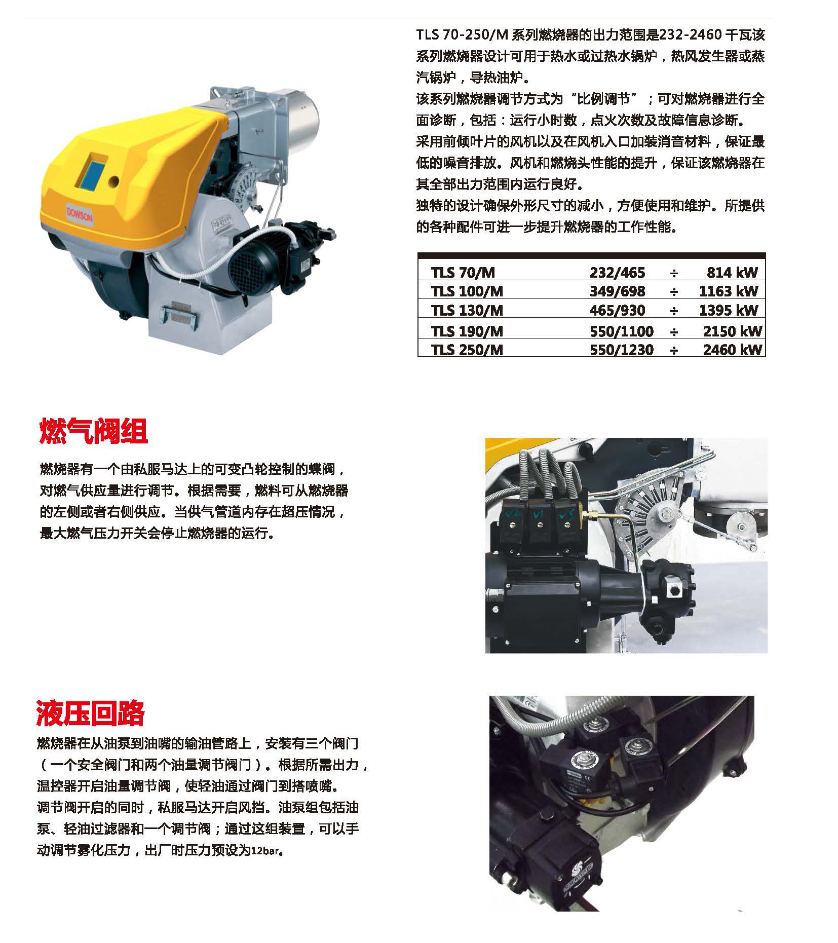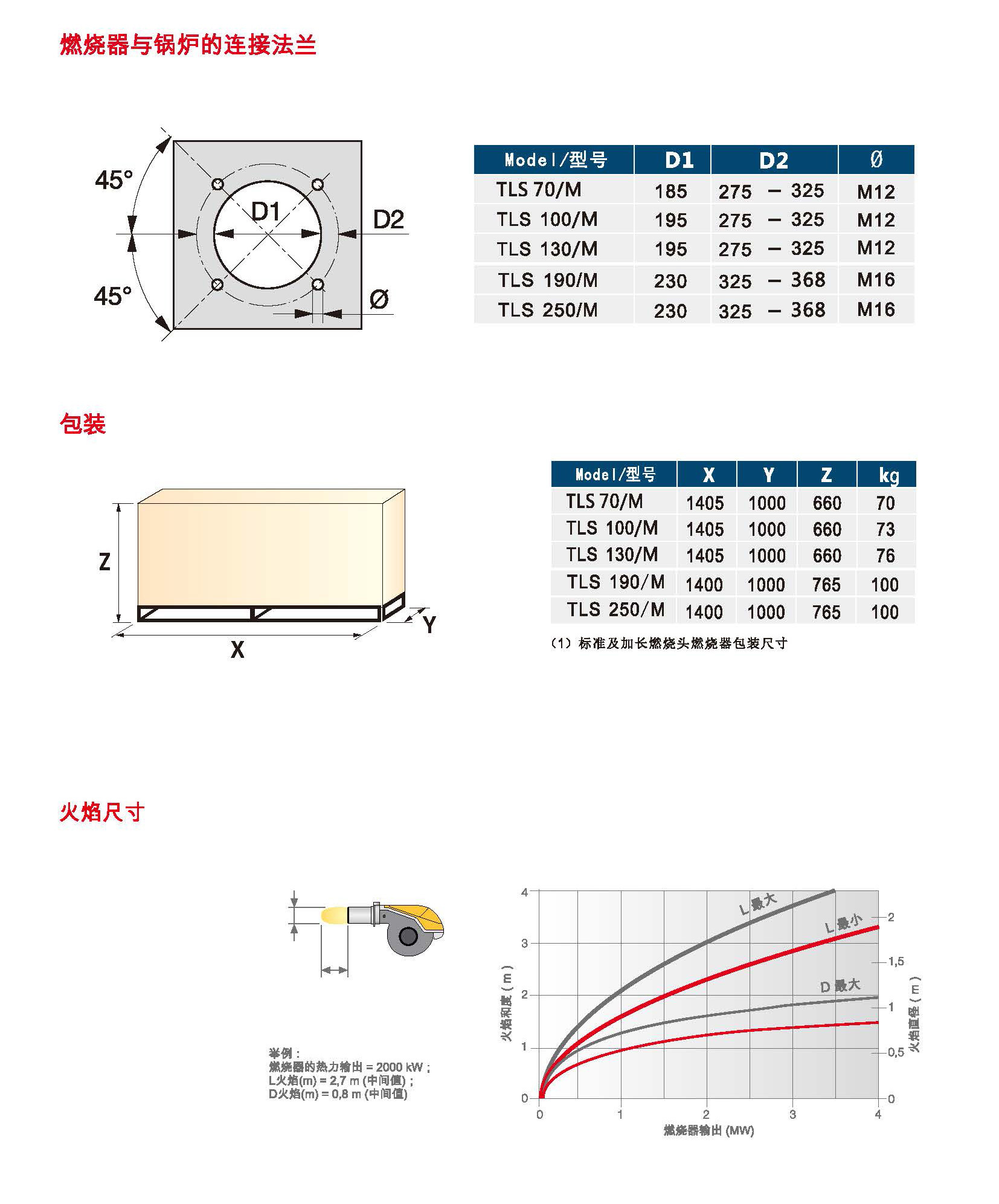 TLS 70-250/M系列燃烧器的出力范围是232-2460千瓦该系列燃烧器设计可用于热水或过热水锅炉,热风发生器或蒸汽锅炉,导热油炉。